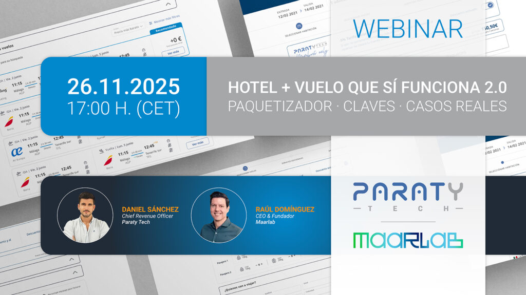 Tras el éxito de la primera convocatoria y ante el elevado número de solicitudes recibidas por parte de profesionales que no pudieron asistir, Paraty Tech y Maarlab celebrarán una segunda edición de su aclamado webinar, dedicado a la integración del paquete Hotel + Vuelo en el canal directo. La nueva sesión, bajo el título “Hotel […]